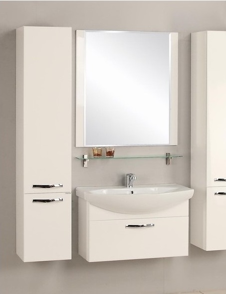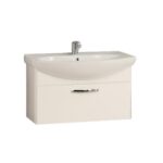 В тумбе расположен ящик с системой организации пространства, изготовленный из декоративной влагостойкой ДСП в отделке «молочный дуб». Ящик установлен на направляющие полного выдвижения немецкого производителя Blum, благодаря чему им удобно пользоваться даже с керамической раковиной, выступающей вперед.