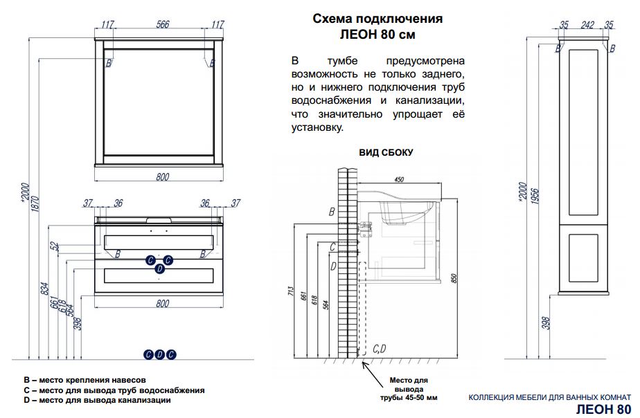 В тумбе установлены 2 ящика, и помимо стандартного подключения водоснабжения и канализации (из стены) предусмотрена возможность подключения труб снизу.