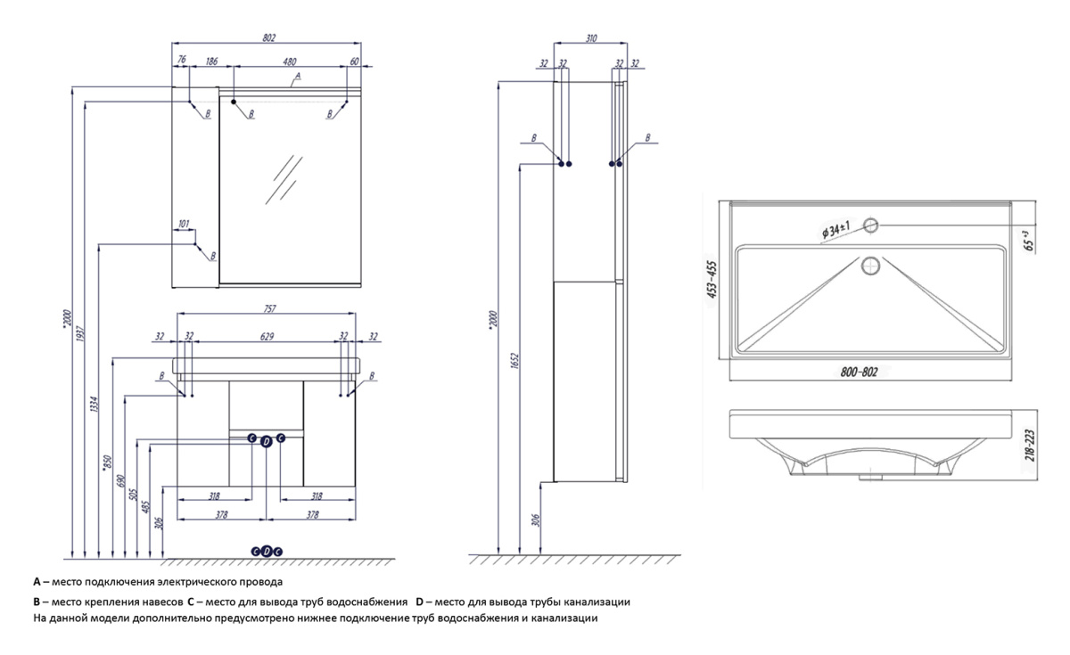 Отделения: 2 выдвижных ящика, 2 распашные дверцы, 2 полки.