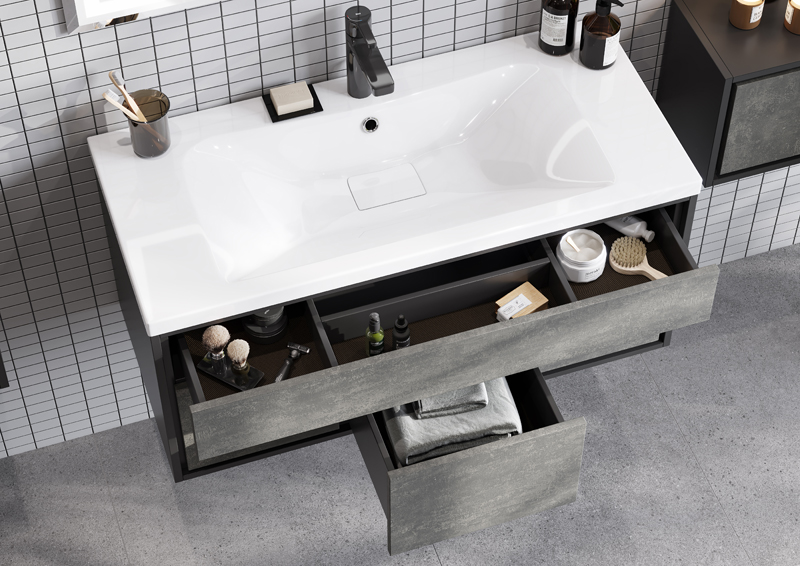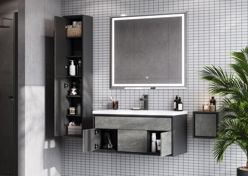 Подвесная тумба Уэльс 100 от AQUATON в стиле лофт создана для истинных ценителей индустриального шика. Глубокий благородный цвет фасадов авеллино грей в сочетании с внутренней отделкой в оттенке тёмный шоколад придаёт модели актуальное звучание, отражая эстетику современной роскоши. Корпус из влагостойкой ЛДСП и фасады из МДФ покрыты матовой пленкой. Отсутствие лицевой фурнитуры подчеркивает сдержанный лаконичный дизайн модели. Тумба предлагает оптимальную систему организации пространства: два вместительных ящика, верхний и центральный, выдвигаются простым нажатием благодаря удобной системе push-to-open, а справа и слева за фасадами-створками скрыты дополнительные отсеки для хранения.