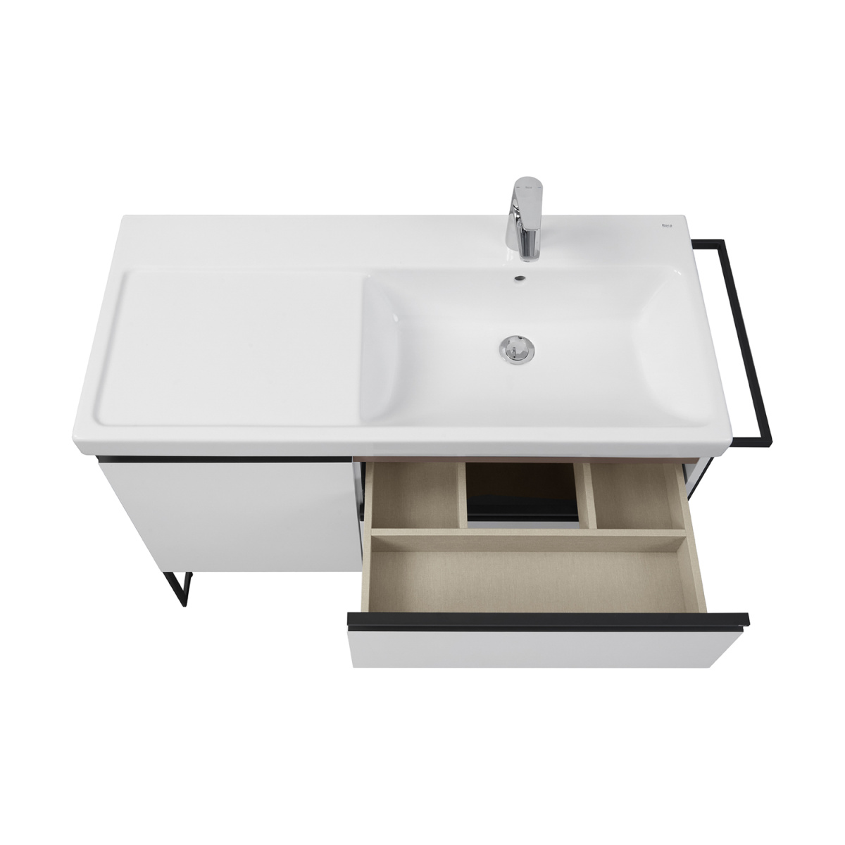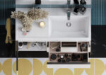 Модуль под раковину Domi с черной матовой металлической ручкой во всю ширину фасада и направляющими с функцией soft-close. Нижняя часть ручки обработана под углом, что предотвращает скопление воды и пыли. Ручка защищает фасады модуля от попадания капель воды с раковины, а также защищает углы модуля от ударов и износа. Внутренняя отделка ящиков выполнена в цвете бежевый текстиль, приятна на ощупь и предотвращает скольжение предметов. Пространство верхнего ящика разделено на три части, что позволяет хранить предметы для ванной комнаты в идеальном порядке. По желанию модуль Domi может комплектоваться черными матовыми опорами, которые представлены в двух вариантах: с полотенцедержателем и без.