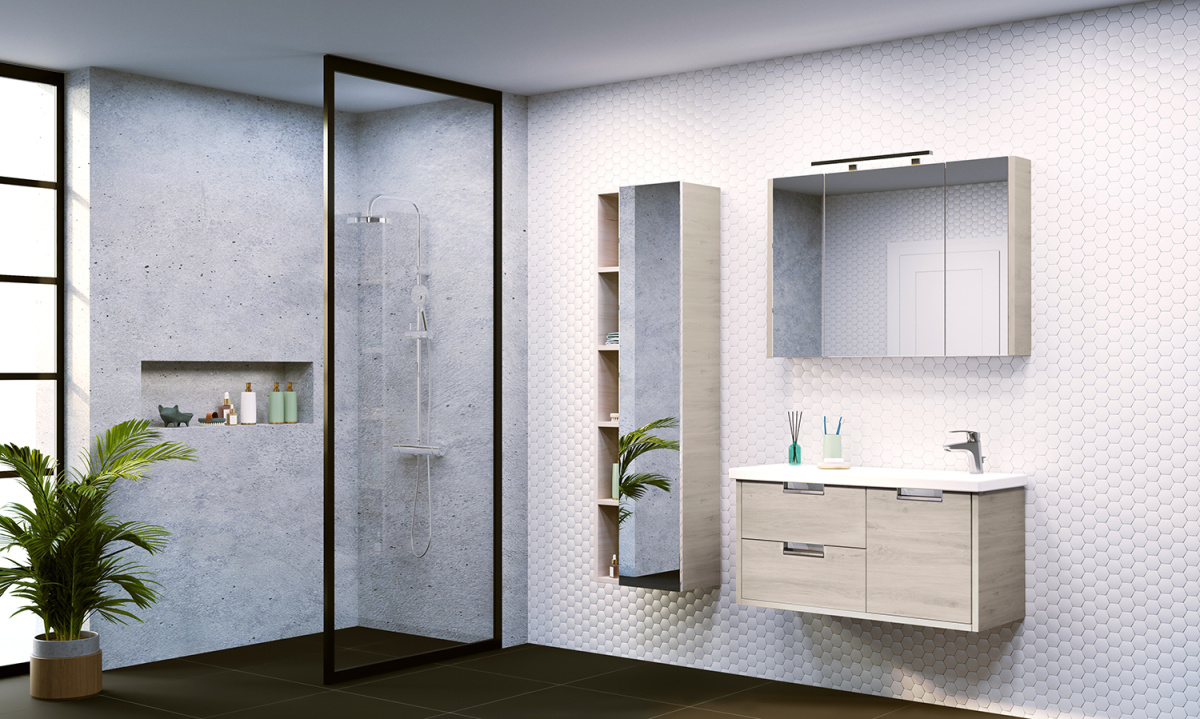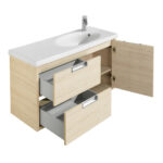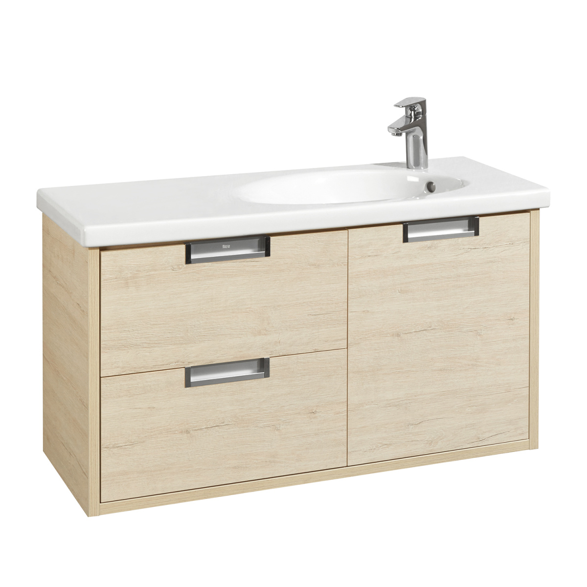 Тумба для раковины Etna в современном стиле от испанского бренда Roca, выполненная из влагостойкой высококачественной ЛДСП с ящиками и распашной дверцей с доводчиками.