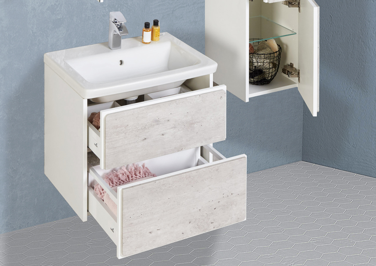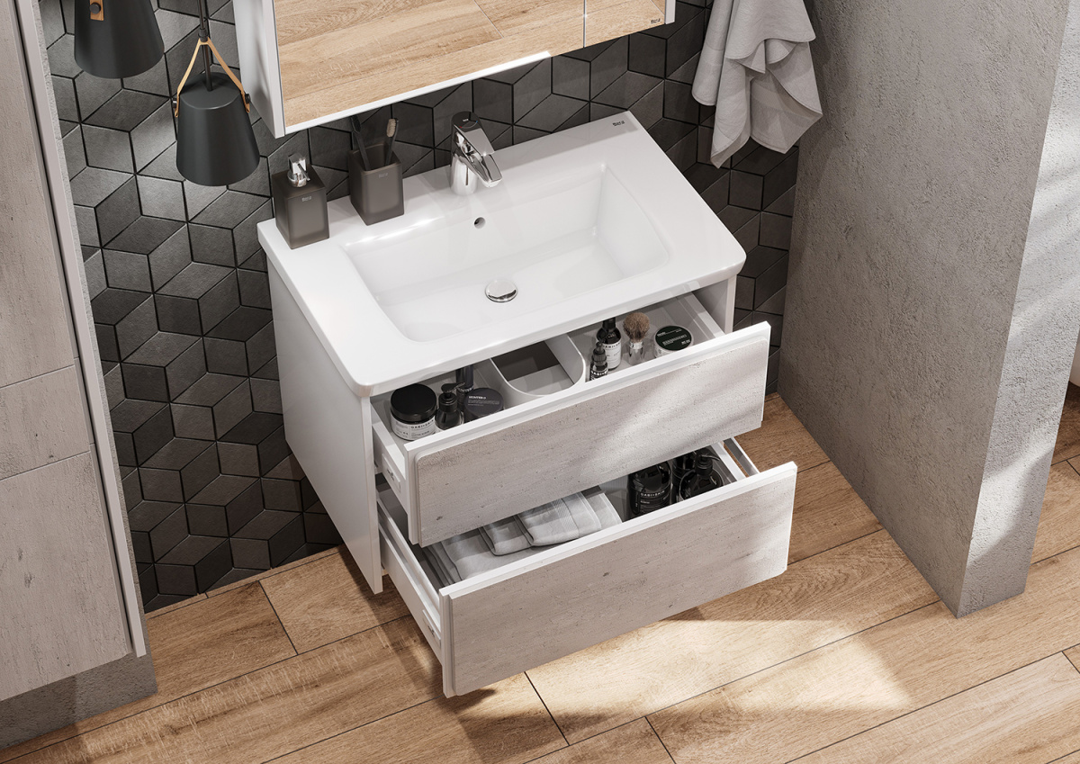 Тумба для раковины Ronda в современном стиле от испанского бренда Roca, выполненная из высококачественной МДФ, с ящиками полного выдвижения с системой push-to-open.