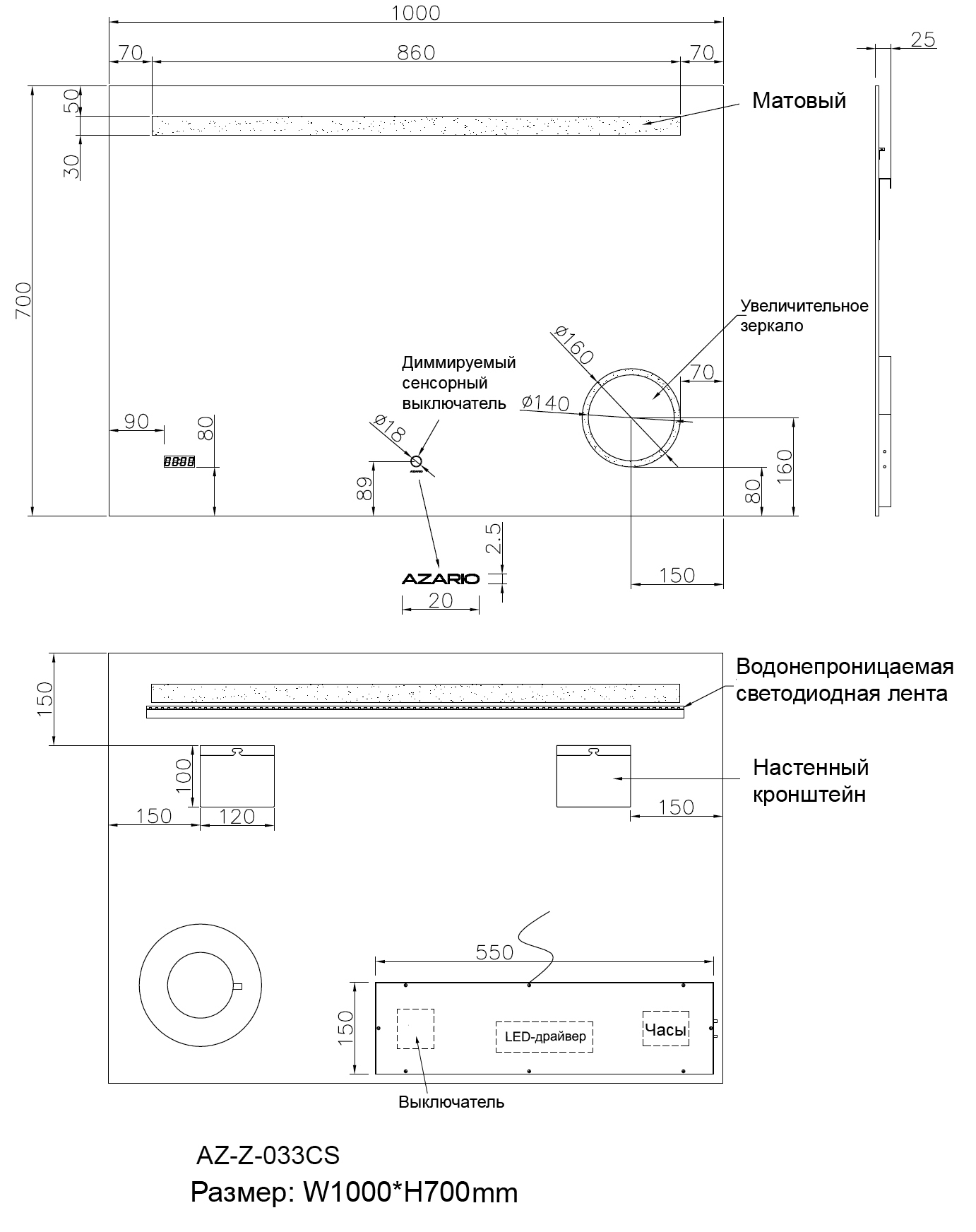 Зеркало AZARIO Alma 1000х700 с подсветкой, сенсорный выключатель с функцией диммера, увеличительное AZ-Z-033CS