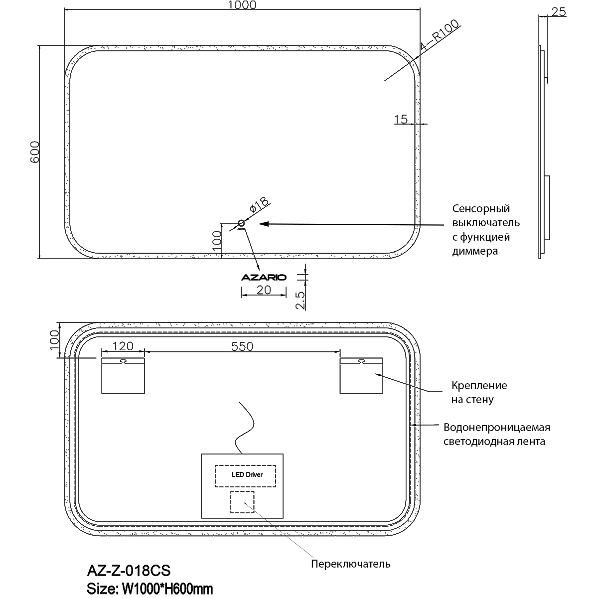 Зеркало AZARIO Glory 1000х600 с подсветкой, сенсорный выключатель с функцией диммера AZ-Z-018CS