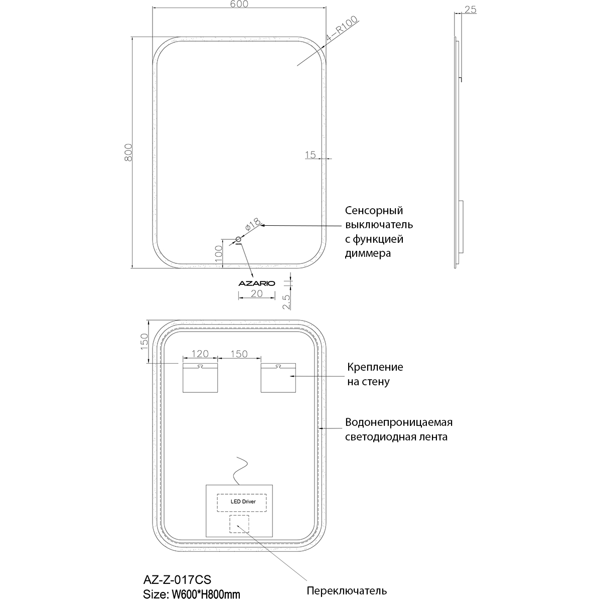 Зеркало AZARIO оснащено LED подсветкой и сенсорным