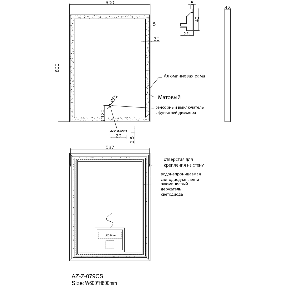 Зеркало AZARIO Havana 600х800 с подсветкой, сенсорный выключатель с функцией диммера, алюминиевая ра AZ-Z-079CS
