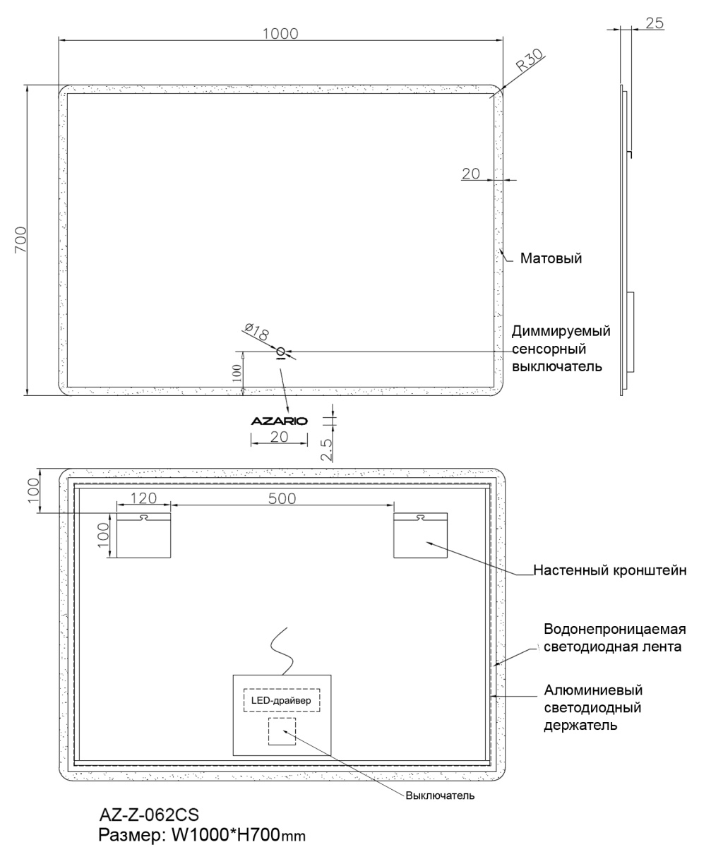 Зеркало AZARIO Lucia 1000х700 с подсветкой, сенсорный выключатель с функцией диммера AZ-Z-062CS
