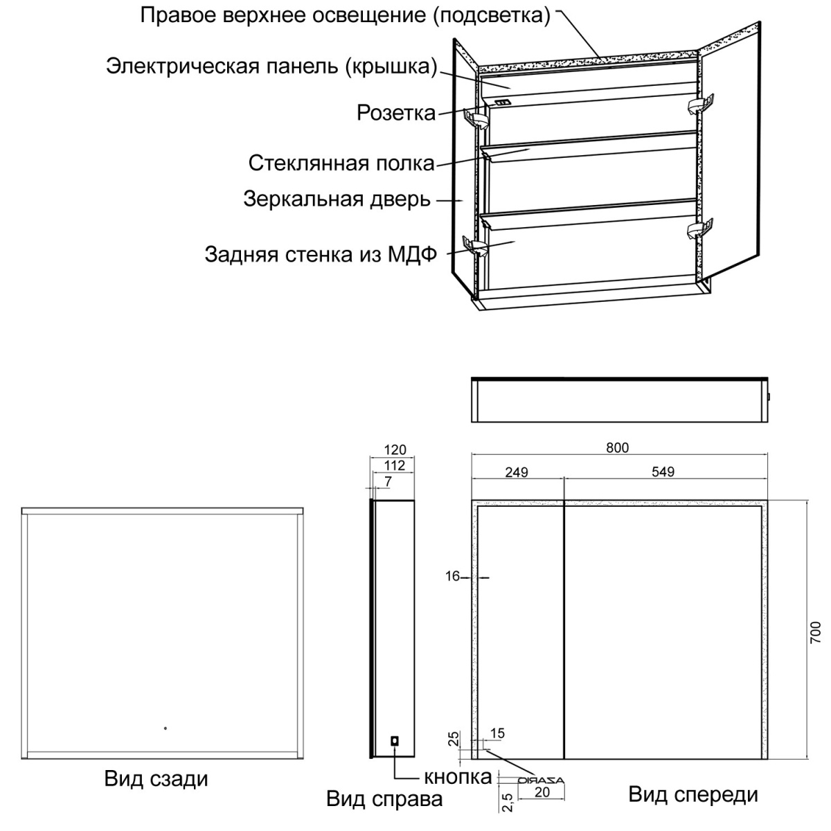 Зеркало-шкаф AZARIO Alliance 800х120х700 правый, с подсветкой, механическая кнопка, алюминиевый корп AZ-ZCLAMC-053CSП