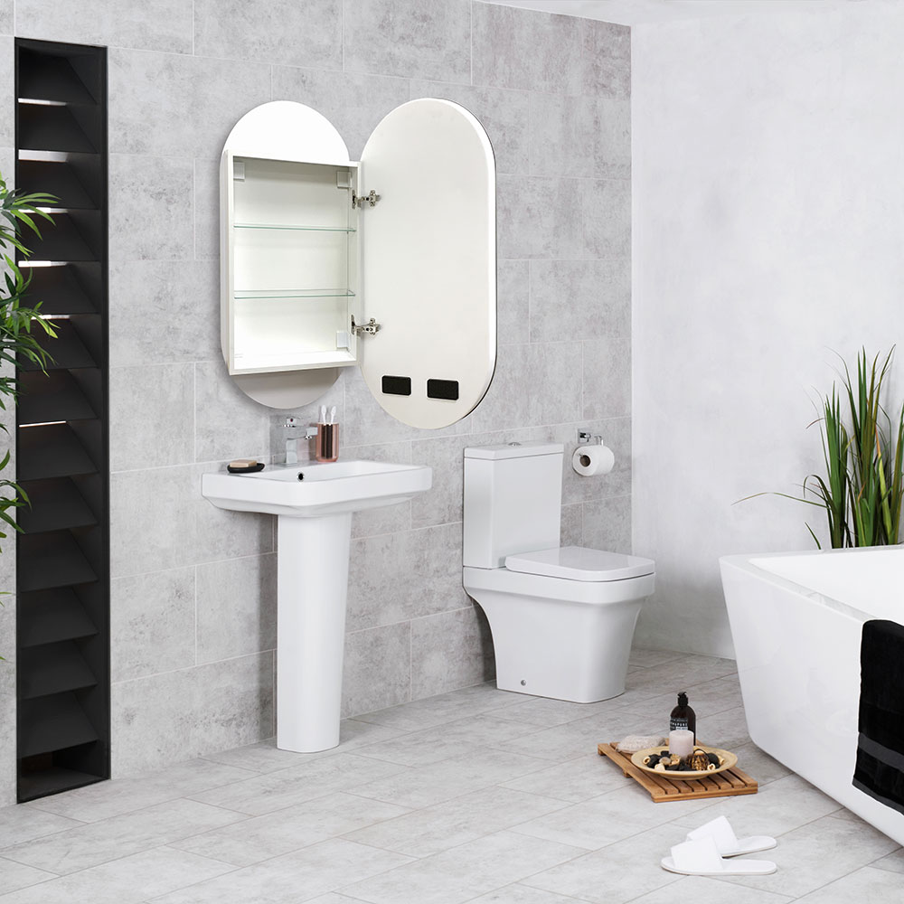 Сочетание зеркала с фронтальной подсветкой и шкафчика станет не только красивым, но и практичным дополнением вашего интерьера.