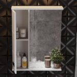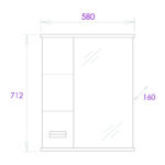 Слева от зеркала за распашной дверцей с механизмом плавного закрывания расположено отделение для хранения, разделенное на две части горизонтальной полочкой, под зеркалом – открытая полочка для косметических средств или декоративных элементов.