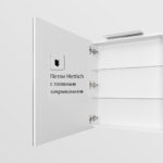 Зеркальный шкаф OLETA оснащен светильником от европейского бренда с возможностью регулировки положения, IP 44, 5 700 K. Теплота света у светильника 5 700 K – это яркий свет, идеальный для нанесения макияжа и бритья. Положение светильника можно регулировать: наклонить слегка вниз или направить свет повыше. За зеркальными фасадами расположены регулируемые по высоте полочки из просветленного стекла. Фасады оснащены петлями с плавным закрыванием.