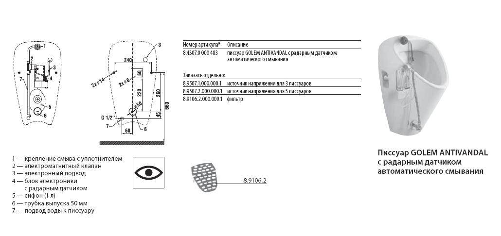 Писсуар Jika GOLEM ANTIVANDAL 30,5х34х53,5 с радарным датчиком, питание от сети, сифон, уст.компл. 8.4307.0.000.483.1