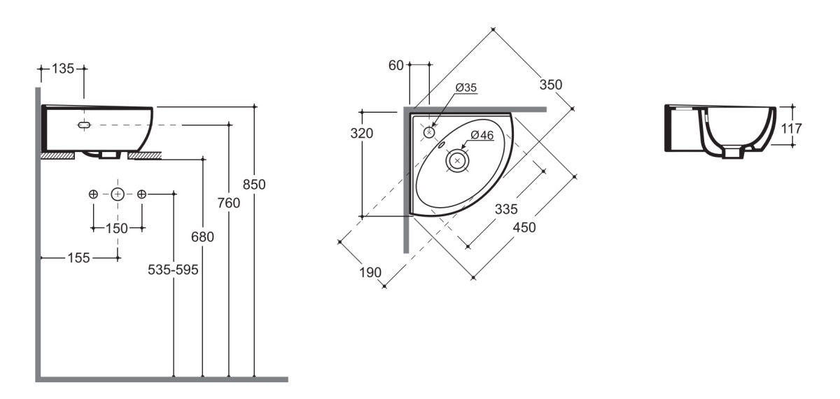 Раковина угловая Керамин Лаго 45 450х350х170 подвесная, крепление в комплекте, белый Раковина углова CS00087559