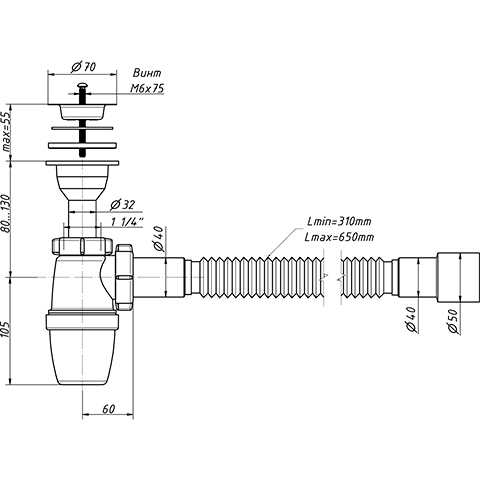 В комплекте идёт полированная нержавеющая чашка д.70мм. Сифон комплектуется нержавеющим винтом длиной 75мм и нержавеющей гайкой. Длина отвода в канализацию от 310 до 650мм. Отвод имеет два диаметра подключения к канализации 40 и 50мм.