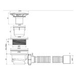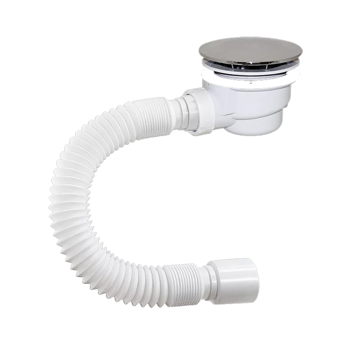 Гидрозатвор создаётся за счёт специального стакана колбы, который можно извлечь после того как снять блестящую декоративную крышку и выбросить накопившейся в нём мусор. Декоративная заглушка-решетка 115мм хромированный пластик. Гибкий отвод позволяет подключить слив сифона к канализации с диаметром 50мм.