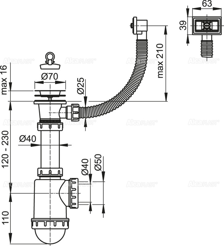 Сифон для мойки Alcadrain с нержавеющей решеткой DN70 и гофропереливом A444-DN50/40