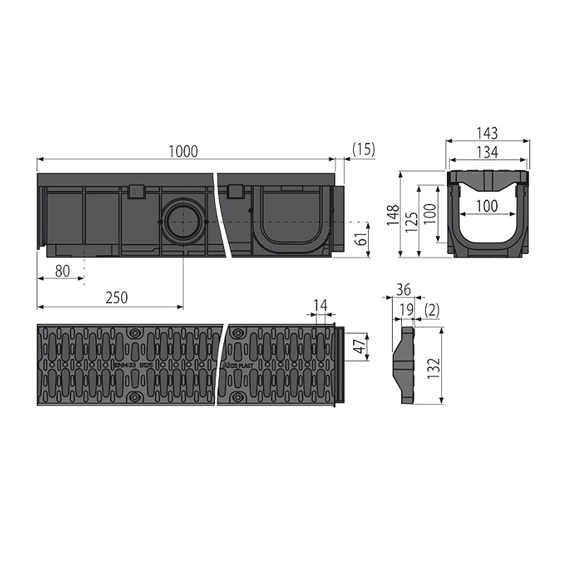 Дренажный канал Alcadrain 100мм, с пластиковой рамой и решеткой из композитного материала AVZ104-R402
