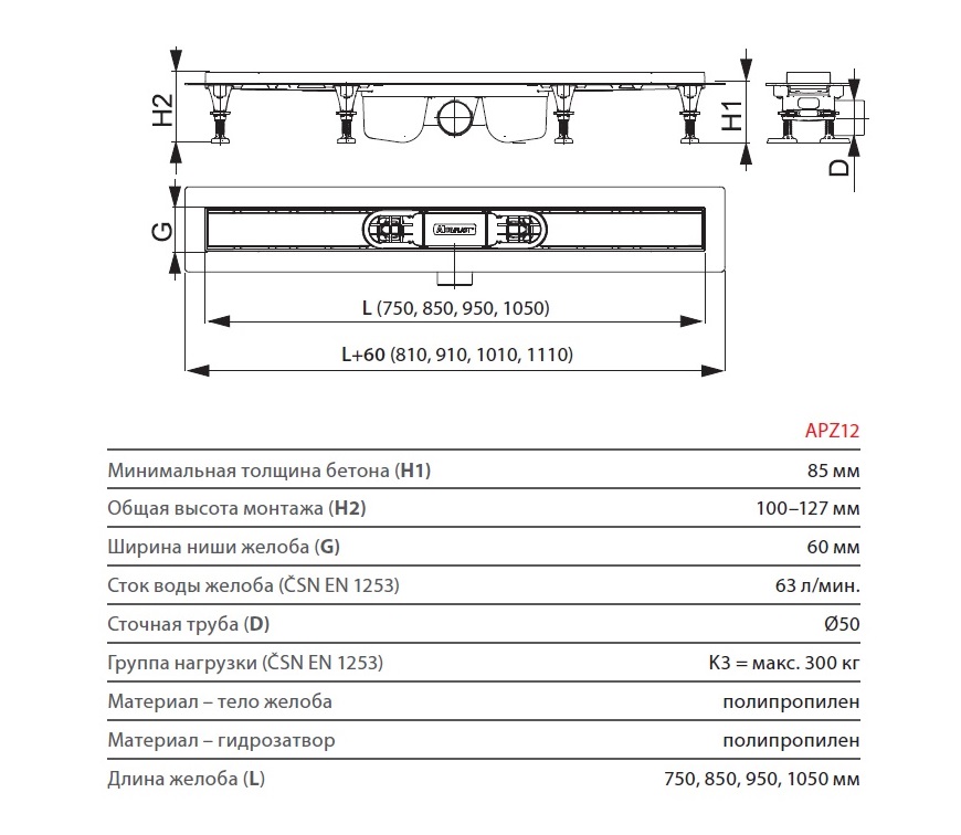 Душевой лоток Alcadrain Optima с порогами для перфорированной решетки или решетки под кладку APZ12- APZ12-950