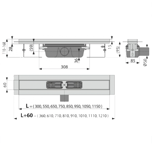 Душевой лоток Alcadrain Professional с порогами для цельной решетки, с горизонтальным сливом, сталь APZ6S-950