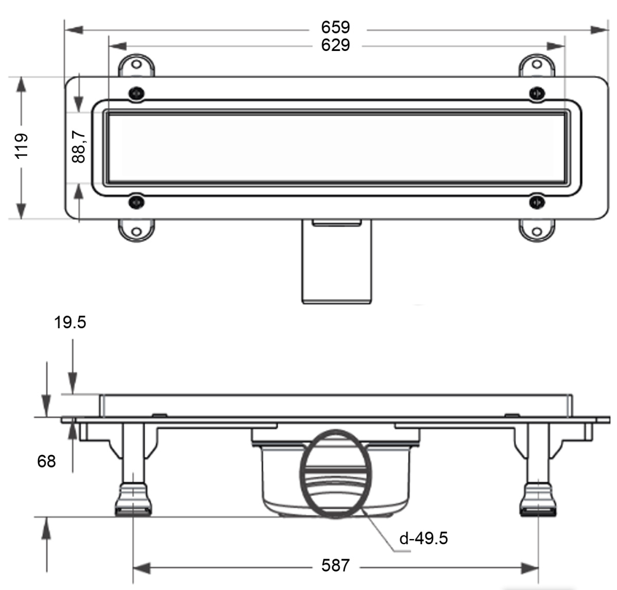 Линейный душевой трап с решеткой из нержавеющей стали, диаметр слива, мм:50