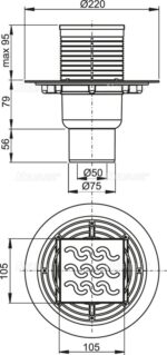 СЛИВНОЙ ТРАП 105×105/50/75 ММ ПРЯМОЙ СТОК, РЕШЕТКА ИЗ НЕРЖАВЕЮЩЕЙ СТАЛИ, ГИДРОЗАТВОР – МОКРЫЙ