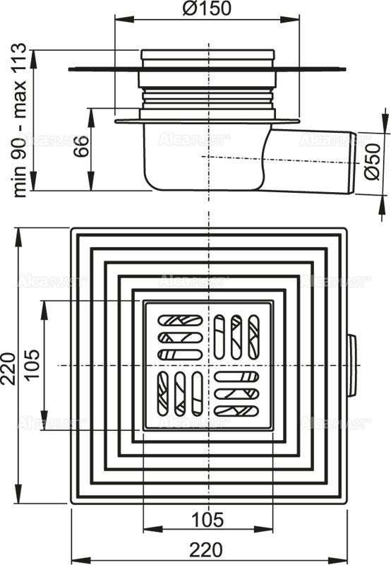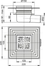 Сливной трап 105 × 105/50 подводка – боковая, решетка – нержавеющая сталь, воротник – 2-х уровневая изоляция, гидрозатвор – сухой, для установки снаружи