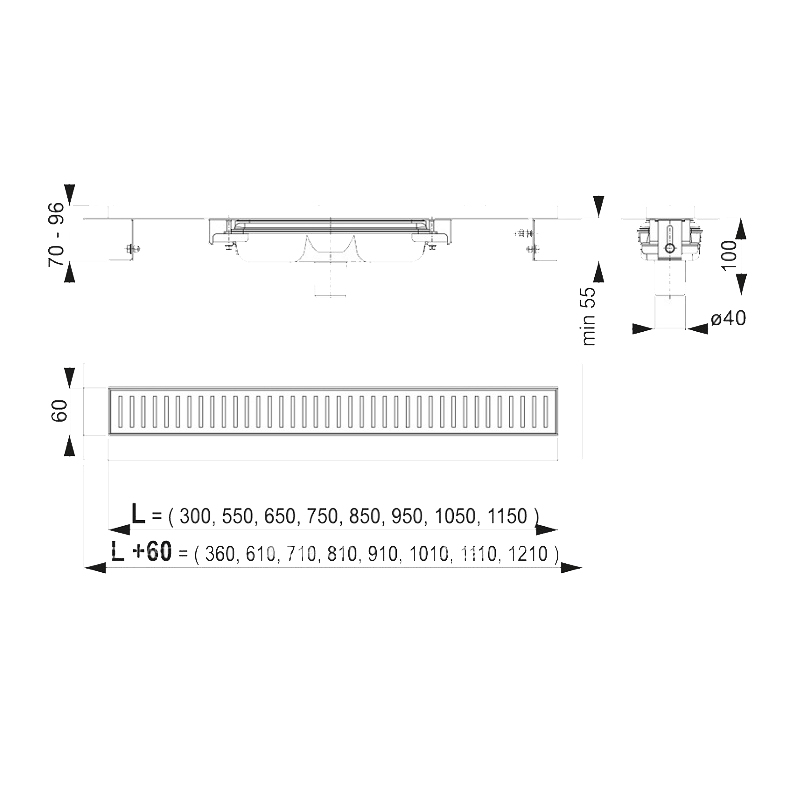 Водоотводящий желоб Alcadrain Low, с порогами для перфорированной решетки, вертикальный сток APZ1101-950