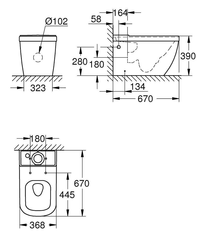 Вихревой смыв GROHE PowerFlush: три выпускных отверстия Triple Vortex дают бесшумный и качественный смыв, вода омывает всю внутреннюю поверхность чаши.