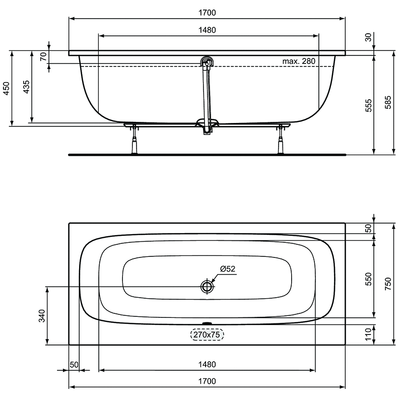 Промо-набор 2 в 1 Ideal Standard состоящий из Ideal Standard i.life Duo Прямоугольная ванна 170х75 см для встраиваемой установки или для монтажа с панелями, без отверстий под смеситель, отверстие слива 52 мм, вместимость 280 л, без ножек, без системы слива-перелива,Универсальная опора (ножки) для встраиваемых акриловых ванн. Комплект включает: регулируемые ножки 4 шт., металлические планки для фиксации ножек 2 шт., металлические профили для настенного монтажа и опоры для бортика ванны (2 шт.), металлические кронштейны для фиксации бортиков ванны к стене 3 шт.
