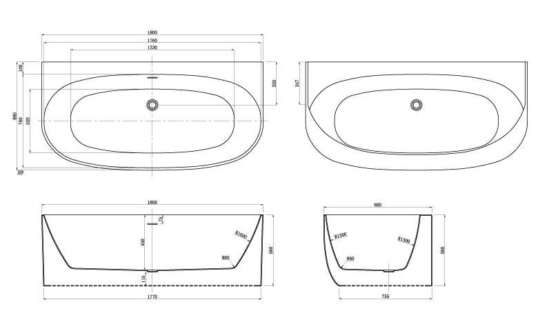 Ванна акриловая Azario Cambridge 1800X880X580, пристенная, в комплекте с сифоном и металлической рам CAM18090