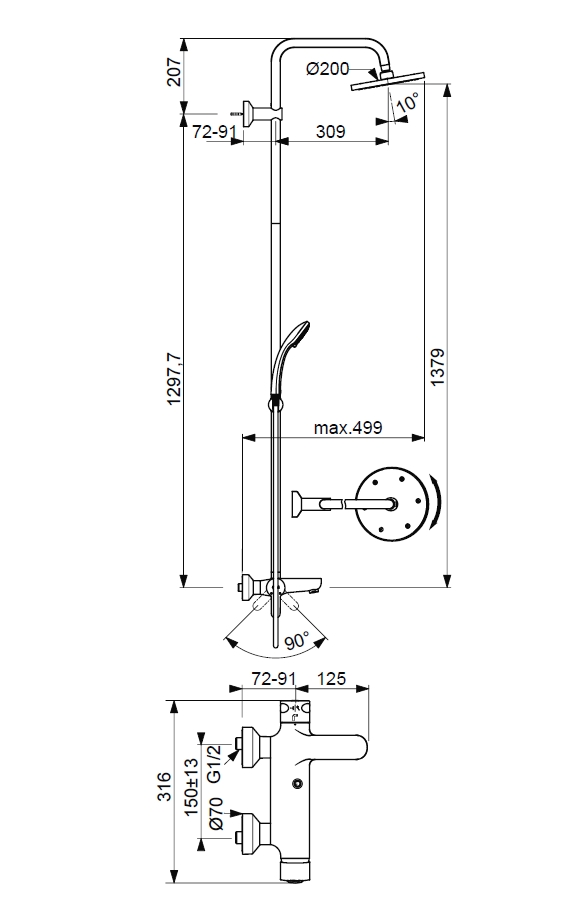 IDEALRAIN ECO SL Душевая система в комплекте с настенным смесителем для ванны/душа CONNECT (с функциями CLICK и HWTC (ограничение горячей воды)), литой излив, металлическая рукоятка, 3-функциональный керамический переключатель, поворот рукоятки 360° с четкой фиксацией каждой позиции, скрытый монтаж, эксцентрики с шумопонижателями, удлиненная душевая труба (1298 мм) Ø25 мм для верхнего душа, пластиковый слайдер с кнопкой, металлические крепления к стене, регулируемое верхнее крепление, пластиковый верхний душ 200 мм, ограничение потока 12 л/мин, шаровое соединение, 3-функциональная душевая лейка 80мм (ограничение потока 8 л/мин.), металлический шланг 1500 мм, обратный клапан