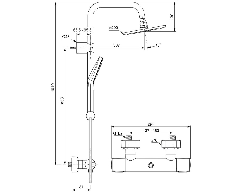 IDEALRAIN CUBE EVO Душевая система в комплекте с настенным термостатическим смесителем для душа с двумя выходами Ceratherm 100; ограничитель температуры (40°), ограничение потока воды, затворы на керамических дисках. Душевая система: регулируемый литой металлический держатель для стены, изогнутая труба закреплена в держателе, 3-функциональная душевая лейка EVO DIAMOND Ø110 мм (ограничение потока 8 л/мин.), ультратонкий верхний душ 200х200 мм (ограничение потока 12 л/мин.), шарнирное соединение, шланг для душа IdealFlex 1750 мм, душевая труба 1051 мм ∅25 мм, пластиковый слайдер