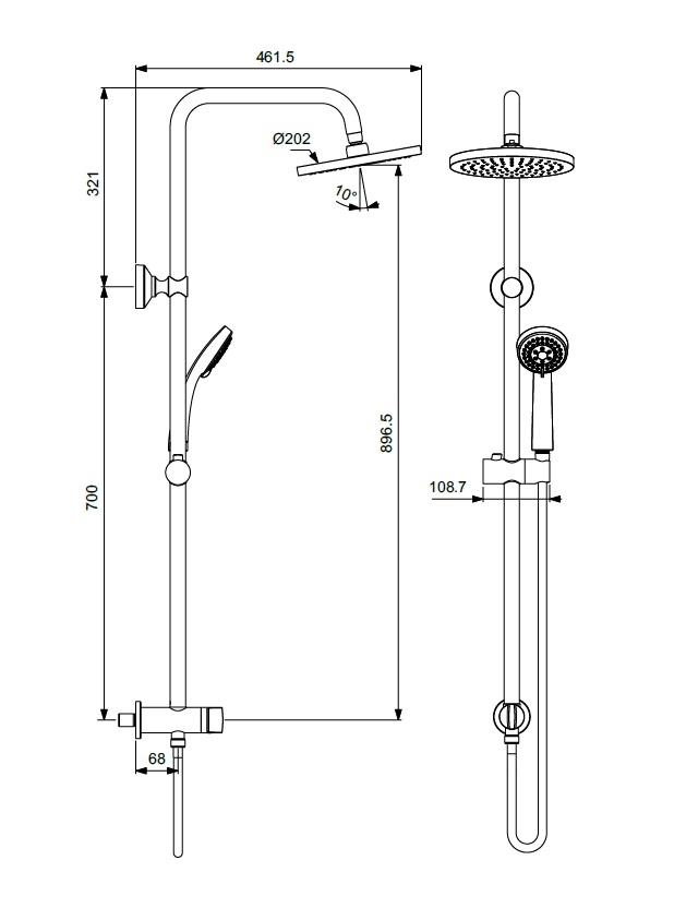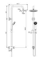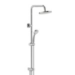 VIDIMA BALANCE Душевая система для монтажа со встраиваемым смесителем. Установка на стену. 2 крепежных элемента, нижний из которых содержит устройство для подключения воды G1/2″ (от трубы, встроенной в стену). Переключение верхний душ / душ: керамический 2-ходовой переключатель Ø40 мм, поворот рукоятки 180°. Входит в комплект: верхний душ 200 мм, пластик; шаровое соединение, ограничение потока 11 л/мин; душевая труба Ø25 мм длиной 897 мм (от переключателя до верхнего душа), латунь, со слайдером с кнопкой для передвижения (пластик); металлический шланг 1500 мм; легкоочищаемая ручная лейка Ø80 мм (B9401AA), 3-функциональная, ограничение потока 8 л/мин., пластик