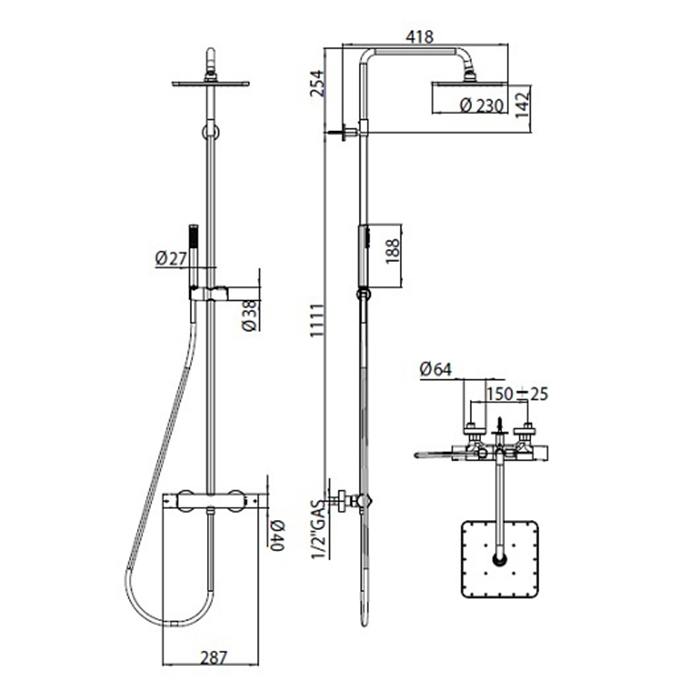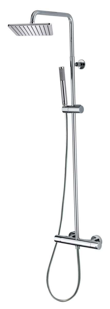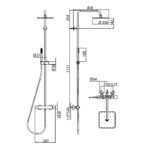 Термостатический смеситель изготовлен из латуни и оснащен внутренним переключателем на два выхода (верхний душ и ручная лейка). Пропускная способность смесителя – 25 л/мин при давлении 3 бар.