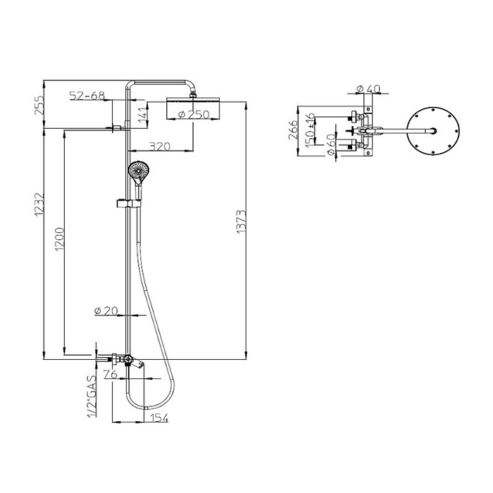 Душевая колонна из латуни диаметром Ø20 мм с внешним термостатическим смесителем и