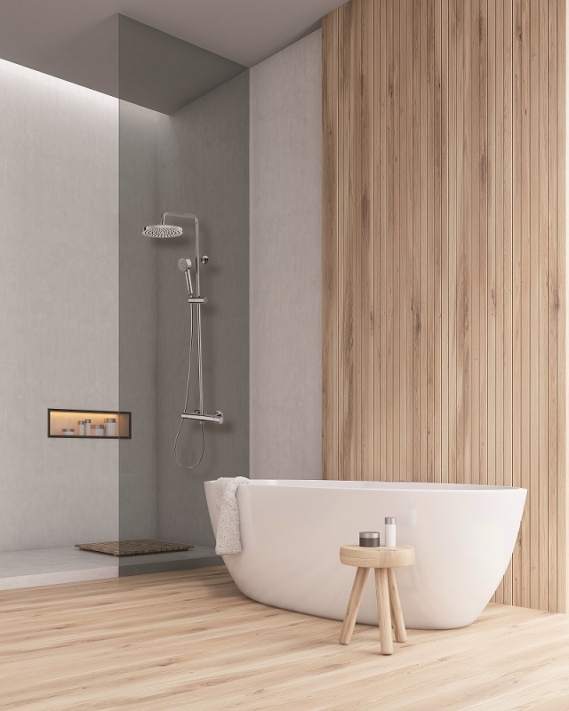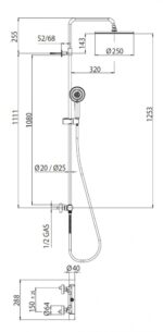 Душевая колонна изготовлена из латуни и оснащена поворотным на 180 градусов держателем верхнего душа.