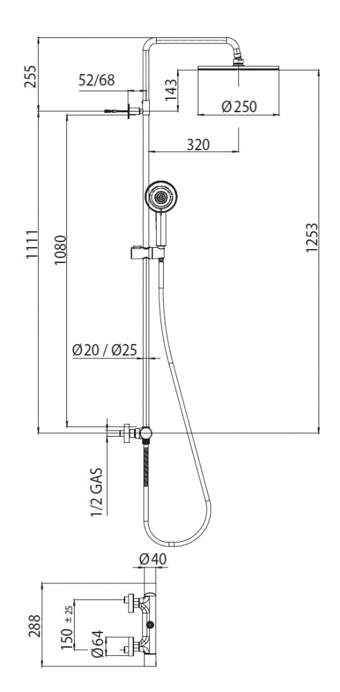 Механический однорычажный смеситель изготовлен из латуни и оснащен внутренним переключателем на два выхода (верхний душ и ручная лейка). Пропускная способность смесителя – 25 л/мин при давлении 3 бар.