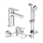 ESLA Промо комплект 3 в 1, состоящий из: BC224AA ESLA Смеситель для умывальника, система монтажа EASY-FIX (облегченный монтаж), аэратор Perlator с ограничением потока 5 л/мин., керамический картридж 35 мм с функцией HWTC, металлическая рукоятка с индикаторами горячей / холодной воды, гибкая подводка G3/8″, пластиковый донный клапан; BC229AA ESLA Настенный смеситель для ванны/душа, монтаж на стандартных эксцентриках (в комплекте: эксцентрики, металлические отражатели, уплотнительные прокладки), аэратор Perlator, керамический картридж 35 мм с функцией HWTC, металлическая рукоятка с индикаторами горячей / холодной воды, автоматическое переключение ванна/душ, обратный клапан; B2621AA IDEALRAIN EVO DIAMOND L3 Душевой гарнитур со штангой 60 см, 3-функциональная лейка Ø110 мм, ограничитель потока воды 8 л/мин, шланг 1750 мм с силиконовым покрытием IDEALFLEX®, пластиковый держатель, мыльница в комплекте. Каждое изделие упаковано индивидуально, все три изделия упакованы в одну промо-коробку 750X285X160.