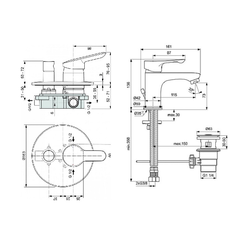 ESLA Промо комплект, состоящий из: BC224AA ESLA Смеситель для умывальника, система монтажа EASY-FIX (облегченный монтаж), аэратор Perlator с ограничением потока 5 л/мин., керамический картридж 35 мм с функцией HWTC, металлическая рукоятка с индикаторами горячей / холодной воды, гибкая подводка G3/8″, пластиковый донный клапан; B9445AA IDEALRAIN L1 Настенный держатель верхнего душа 400 мм, металлический, с металлической накладкой; B2619AA IDEALRAIN EVO DIAMOND L3 Душевой комплект с настенным держателем, 3-функциональная лейка Ø110 мм, ограничитель потока воды 8 л/мин. (пластик), шланг 1750 мм с силиконовым покрытием IDEALFLEX® (пластик), пластиковый держатель; B0387MY IDEALRAIN LUXE Квадратный верхний душ 200X200 мм, ультратонкий дизайн, 1-функциональный, ограничение потока 12 л/мин., легкоочищаемый (резиновые форсунки), полированная нержавеющая сталь; A6947AA ESLA Встраиваемый смеситель для ванны/душа, комплект №1 A1300NU (встраиваемая часть) + комплект №2 (внешняя часть), картридж 47 мм с функцией HWTC, с