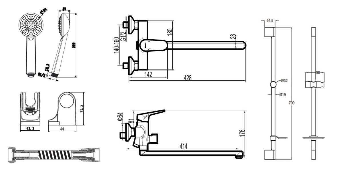 Набор для ванны Bravat Eler смеситель для ванны с длинным изливом, штанга, лейка 1 режим, шланг 1,5 F00449CP