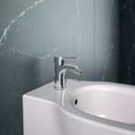 ALPHA Смеситель для биде с пластиковым донным клапаном, система монтажа EASY-FIX (облегченный монтаж), гибкая подводка G3/8″, картридж 35 мм с функцией HWTC (ограничение максимальной температуры горячей воды), с функцией CLICK (ограничение потока воды), металлическая рукоятка с индикаторами горячей / холодной воды, аэратор на шаровом шарнире