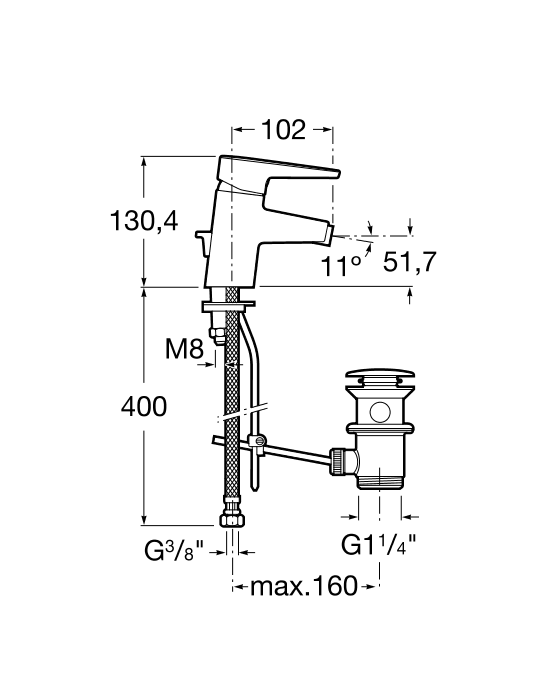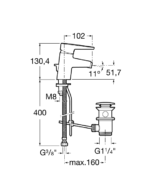 Смеситель для биде с шарнирным регулятором потока, донным клапаном и гибкой подводкой.
