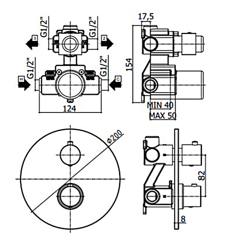 Смеситель термостат встраиваемый для душа 2 выхода с накл.металл диам.200мм, девиатор-картридж, 2 положения+стоп, Белый матовый