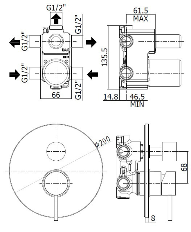 Смеситель встраиваемый для душа  на 3 выход с накладкой из металла диам.200мм, девиатор-картридж, 3 положения+3 комбо, Хром