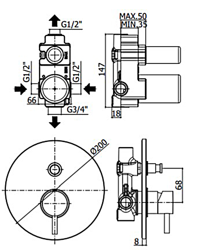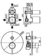 Смеситель встраиваемый для душа на 2 выход с накладкой из металла диам.200мм, девиатор-кнопка, Хром