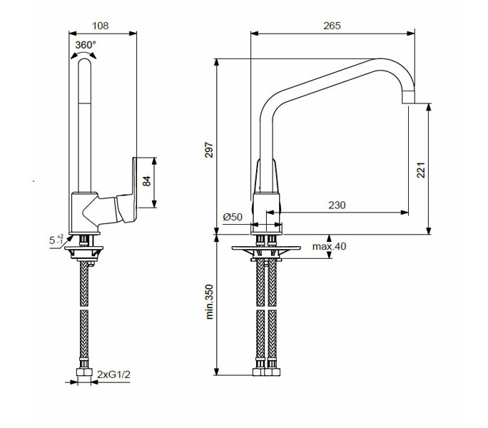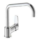 VIDIMA BALANCE Смеситель для кухонной мойки, система облегченного монтажа StrongFix, литой поворотный излив, длина излива 180 мм, угол поворота 360˚, керамический картридж 35 мм, металлическая рукоятка с индикаторами горячей / холодной воды, подводка гибкая G1/2″