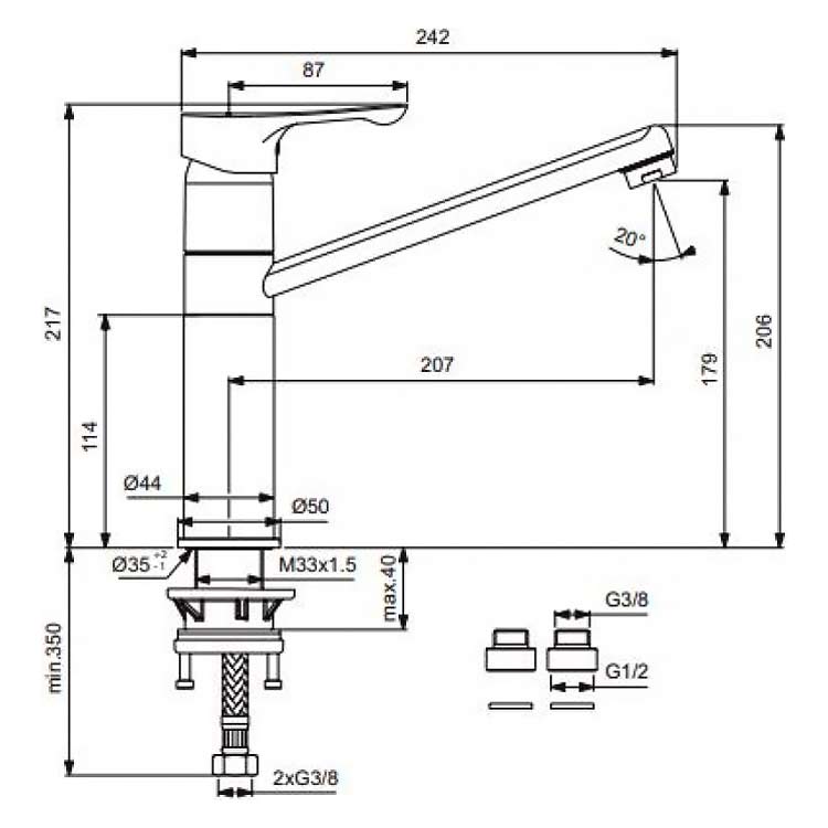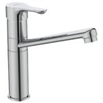 VIDIMA WAVE Смеситель для кухни, система монтажа IS-Fix, StrongFix® (дополнительная пластиковая монтажная накладка для лучшей установки на стальной мойке)трубчатый поворотный излив 207 мм, угол поворота 360˚, аэратор Perlator, картридж 35 мм с функцией HWTC, металлическая рукоятка с индикаторами холодной/горячей воды, гибкая подводка G3/8″, переходник на 1/2″ в комплекте, шланги стандартной длины 400 мм