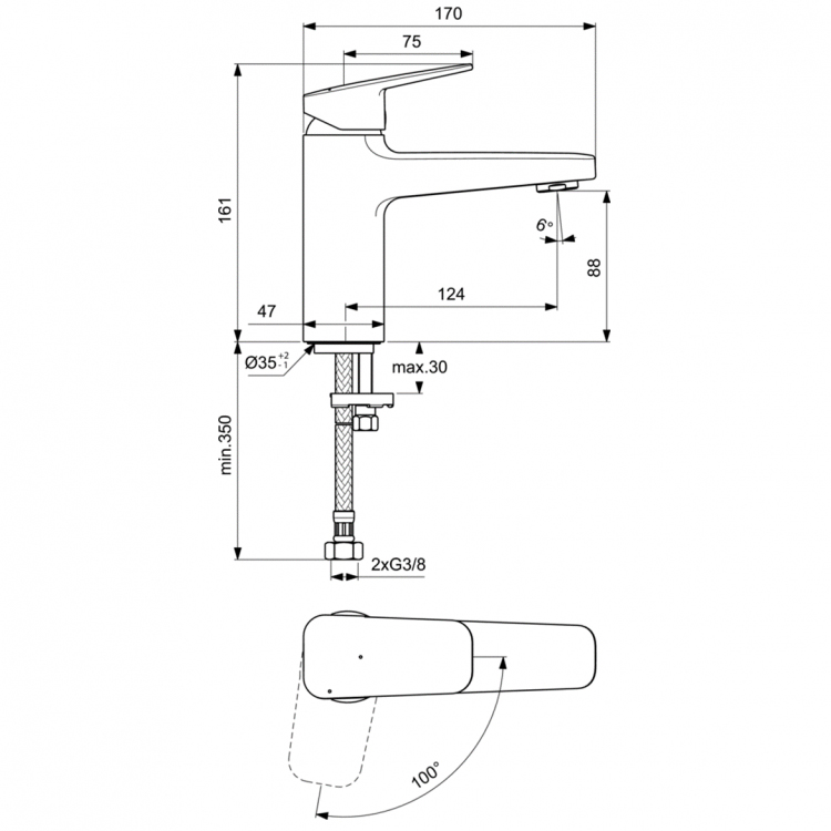 CERAPLAN Смеситель для раковины без донного клапана, технология Blue Start, система монтажа EASY-FIX (облегченный монтаж), гибкая подводка G3/8″, картридж FirmaFlow 38 мм с функцией HWTC (ограничение максимальной температуры горячей воды), металлическая рукоятка с индикаторами горячей / холодной воды, аэратор Slim с ограничением потока 5 л/мин