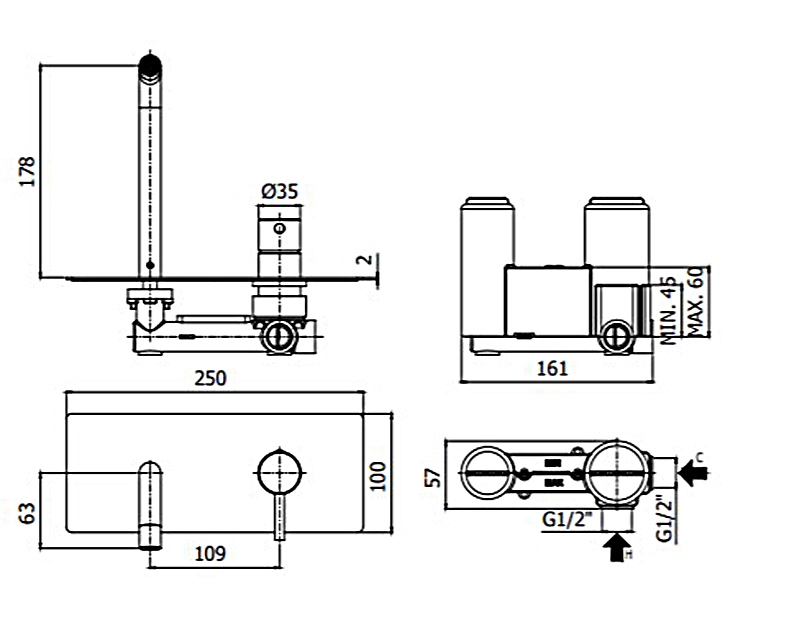 Смеситель для раковины встраиваемый, накладка нерж сталь 250х100мм, излив 178мм, LIG105CR, Paffoni, Черный матовый
